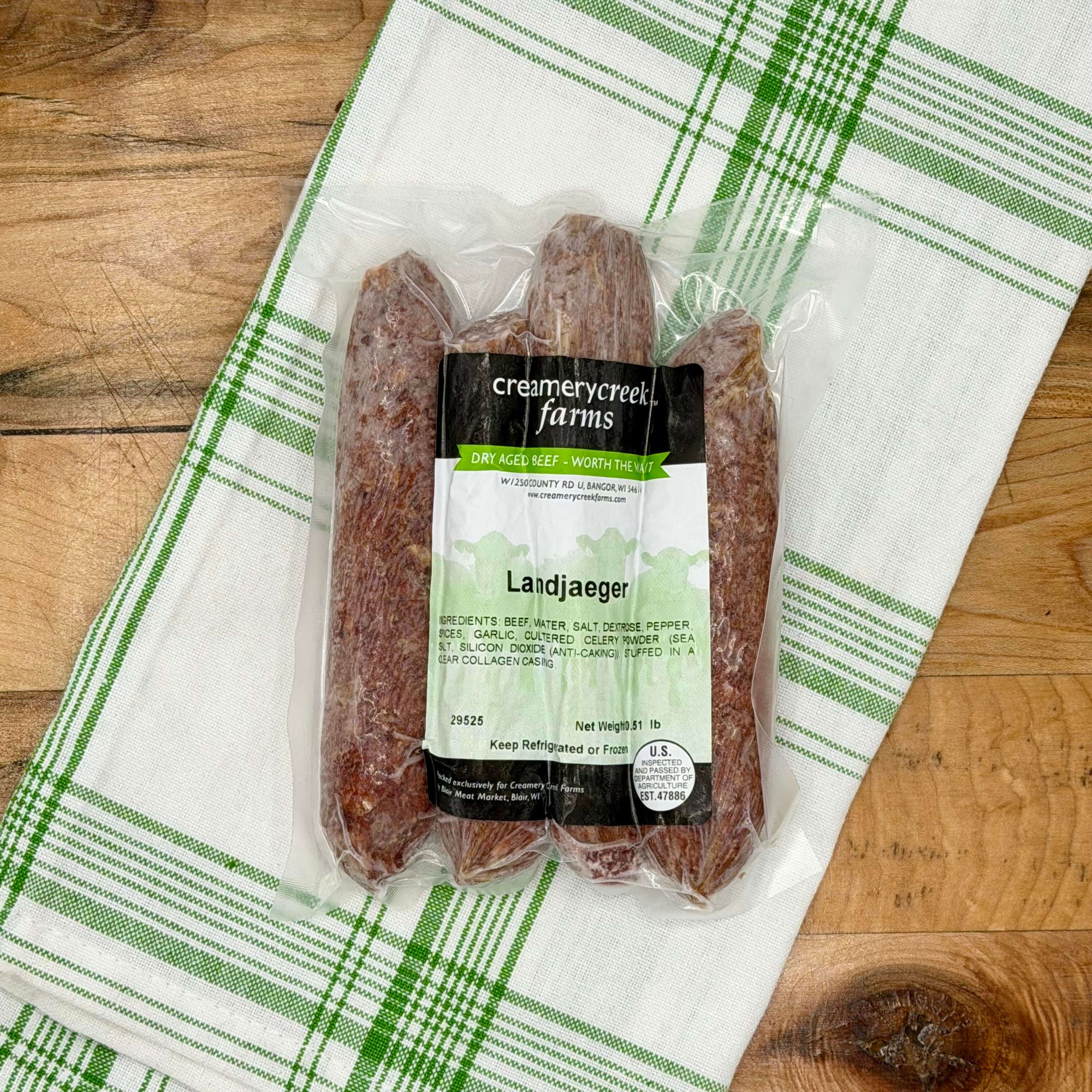 Our All-Beef Landjager is a nod to old-world tradition with a Creamery Creek twist. Crafted from 100% dry-aged beef and lightly smoked, these hearty sticks are firm, flavorful, and made for adventure.